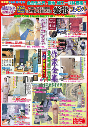 2025.12.05 【西明石本店】 令和7年12月5日(金)〜12月15日(月) 感謝祭大バーゲン 全品仕立代・裏地・加工一式サービス! さらにお買い上げ合計金額15万円以上ご購入の方に袋帯プレゼント ※火曜日定休 ※12月5日(金)~12月8日(月)午前10時~午後7時 ※12月10日(水)~12月29日(月)午前10時~午後6時