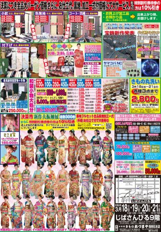 2022.3.15 【姫路じばさんびる9階】 令和4年3月18日(金)〜3月21日(月) 決算市大バーゲン祭 全品超激安価格 200畳の大広間にて特別価格で大御奉仕 全品お仕立て代、裏地代、加工一式付価格で大サービス! ※3月18日(金)〜3月20日(日) 午前10時〜午後7時 ※3月21日(月) 午前10時〜午後2時