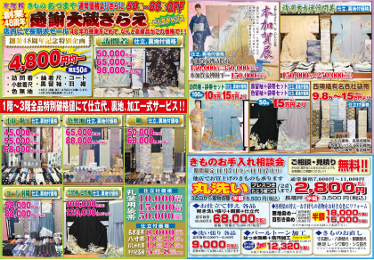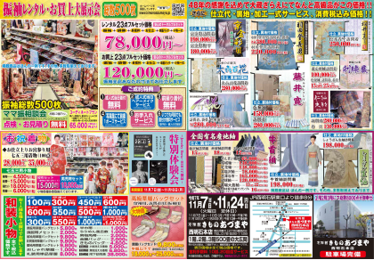 2025.11.07 【西明石本店】 令和7年11月7日(金)〜11月24日(月) 感謝大蔵ぎらえ 店内にて長期セール43年の感謝をこめて、なんと高級品がこの価格 1階~3階全品特別破格値にて仕立代、裏地、加工一式サービス! ※火曜日定休 ※11月7日(金)~11月10日(月)午前10時~午後7時 ※11月12日(水)~11月24日(月)午前10時~午後6時
