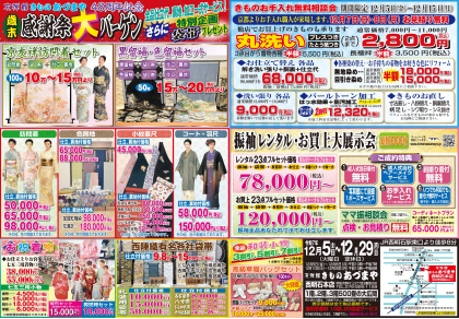2025.12.05 【西明石本店】 令和7年12月5日(金)〜12月15日(月) 感謝祭大バーゲン 全品仕立代・裏地・加工一式サービス! さらにお買い上げ合計金額15万円以上ご購入の方に袋帯プレゼント ※火曜日定休 ※12月5日(金)~12月8日(月)午前10時~午後7時 ※12月10日(水)~12月29日(月)午前10時~午後6時