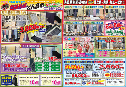 2026.03.06 【西明石本店】 令和8年3月6日(金)〜3月22日(日) 決算 超破格値どん底市ビッグチャンス 1階、2階、3階500畳の大広間にて開催 決算特別超破格値さらに仕立代・裏地・加工一式付! ※火曜日定休 ※3月6日(金)~3月9日(月)午前10時~午後7時 ※3月11日(水)~3月22日(月)午前10時~午後6時
